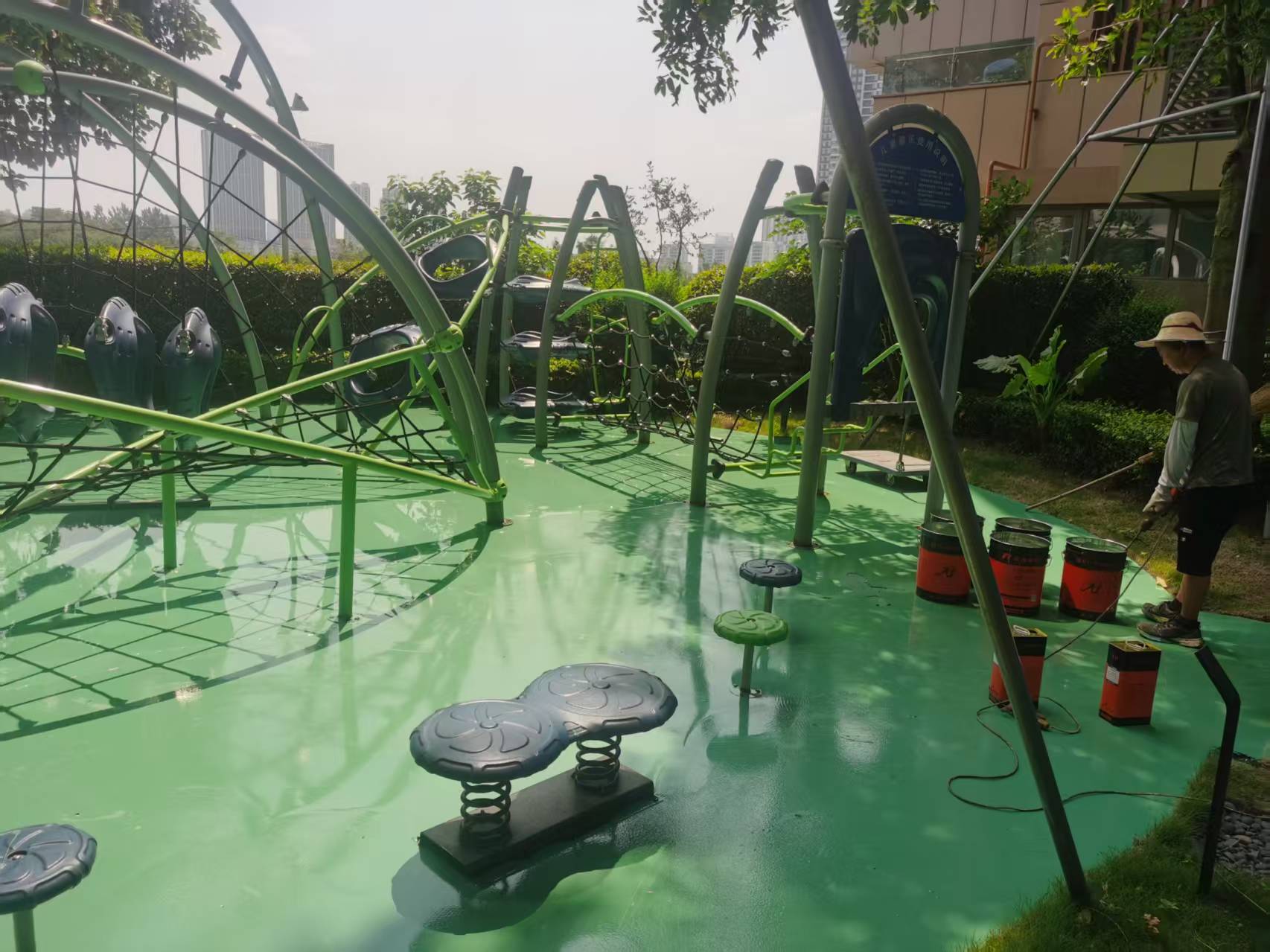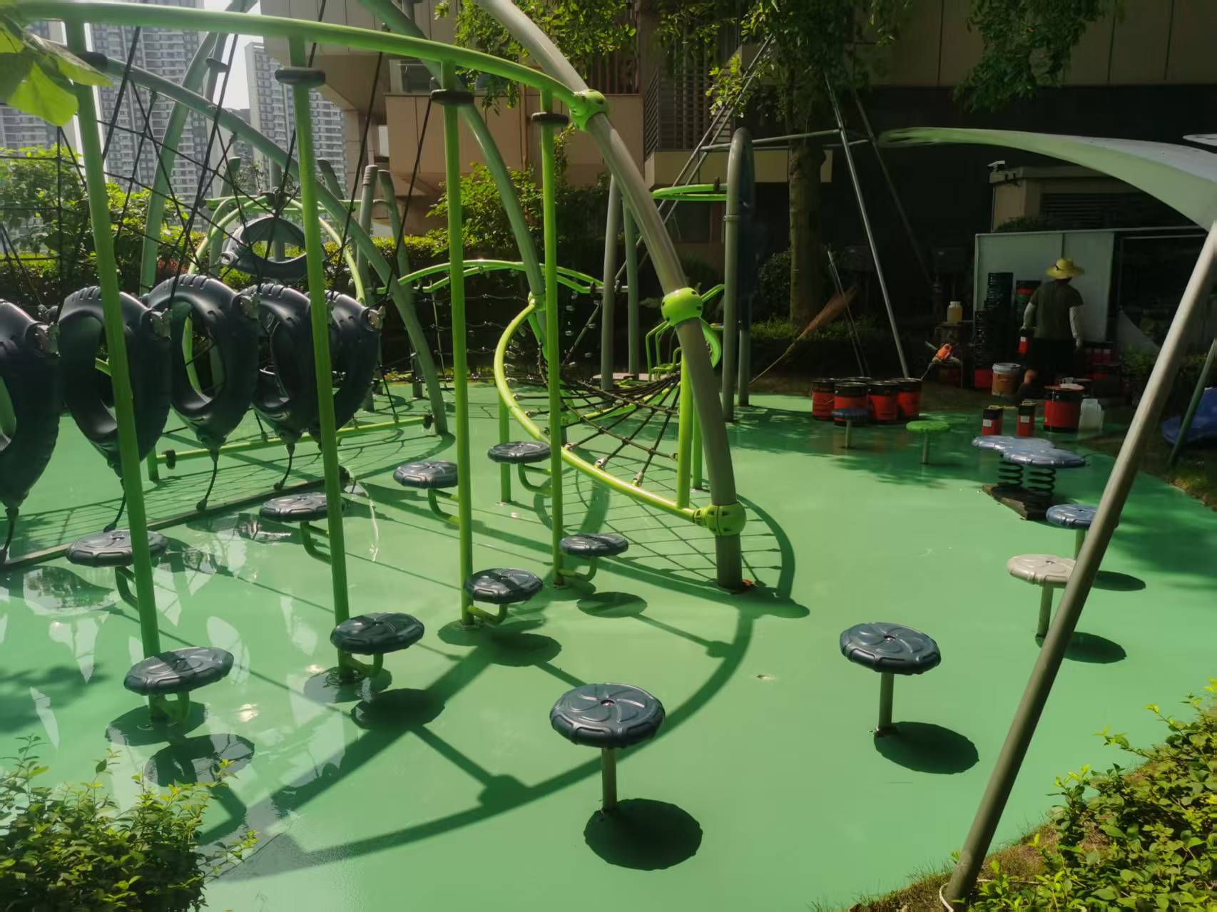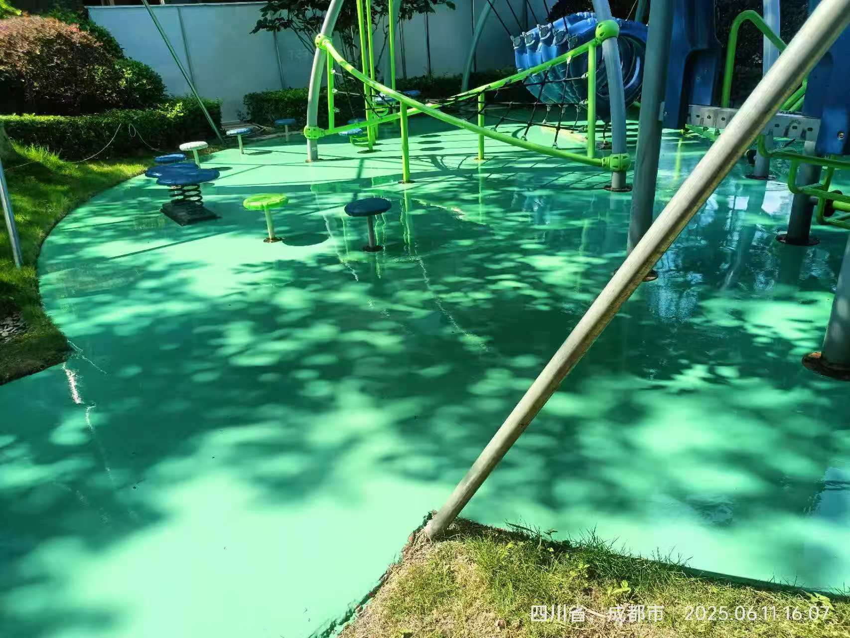 2025年6月13日我公司中标的万华麓湖五彩林堤游乐场混合型塑胶面层施工中