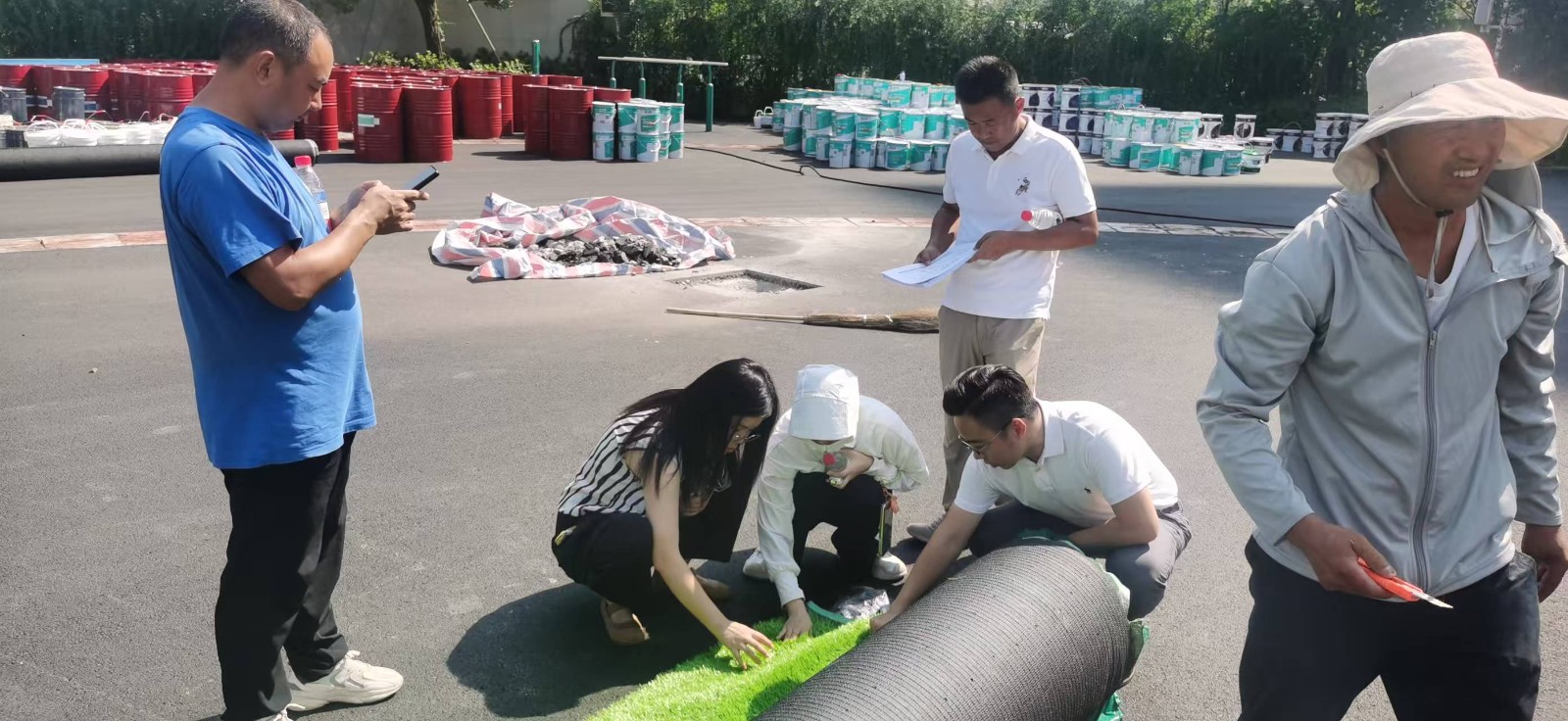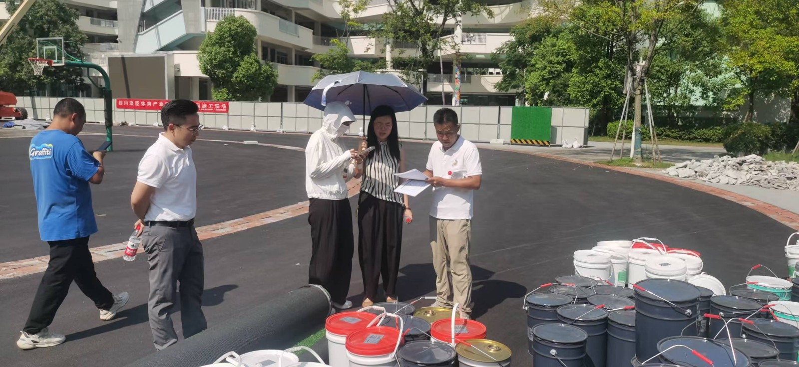 2025年7月28日天府新区麓湖小学运动场维修改造工程XKTY.COM-星空塑胶跑道材料、硅Pu材料、足球场人造草坪,建设单位对进场材料进行现场查验