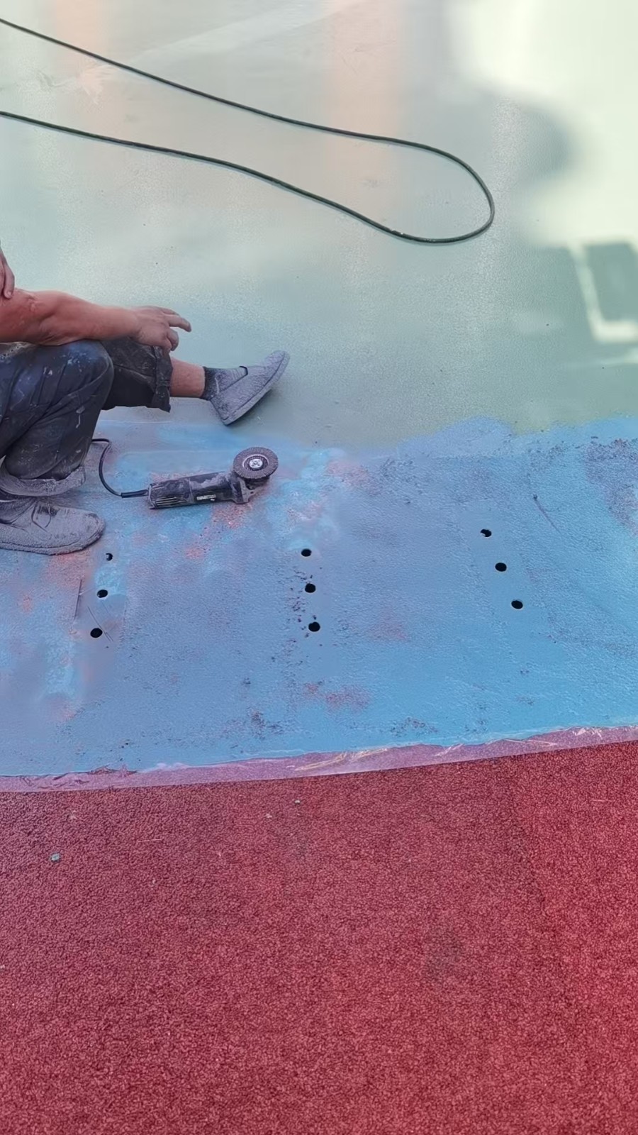 2025年7月29日天府新区麓湖小学运动场维修改造工程屋面人造草坪施工中